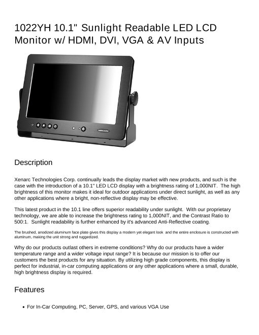 10.1インチワイド液晶モニター(16:9) HDMI入力、DVI入力、VGA入力、ビデオ入力 x 2、太陽光の下でも見える高輝度タイプ (1022YH 10.1" Sunlight Readable LED LCD Monitor w/ HDMI, ...
