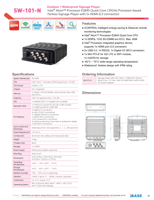 デジタルサイネージ向け、Atom E3845搭載、IP68防塵防水対応