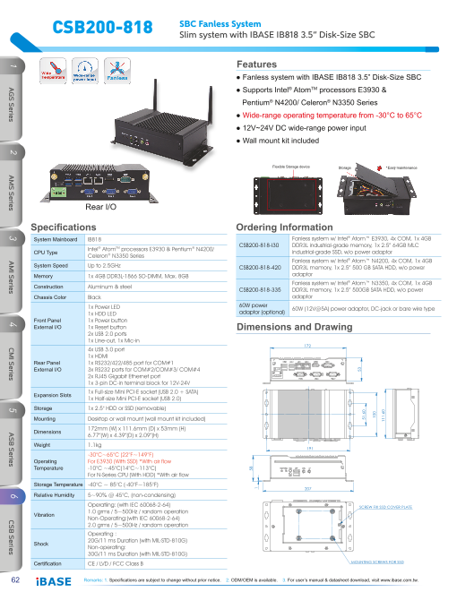 特長 ■幅172×高さ53×奥行111.6mm 1.02リットル ■Pentium N4200/Celeron N3350/Atom x5-E3930 CPU ■ファンレス動作 ■1リットルコンパクトサイズ ■拡張温度対応 -30~65℃(SS...