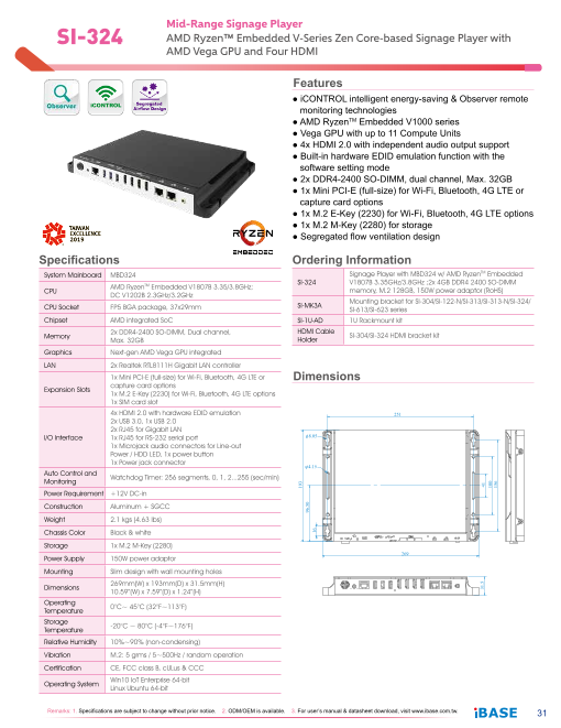 特長 IBASE SI-324正面 ■幅269×高さ31.5×奥行193mm 1.64リットル ■AMD Ryzen Embedded V1807B 3.35GHz APU ■2x DDR4-2400 メモリ 32GB対応 ■Radeon Veg...