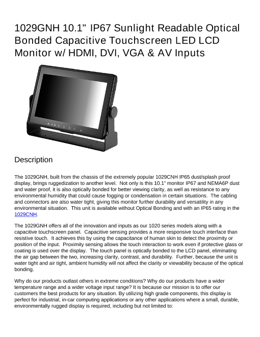 特長 ・防塵防水が必要な車載、船舶のPC,POS,GPS,DVD,カメラなどのモニター用途 ・防塵防水が必要な屋外、工場のPC,DVD,カメラなどのモニター用途 ・太陽光の下でも見える高輝度(1000NIT)、長寿命LEDバックライトパネル採用 ...