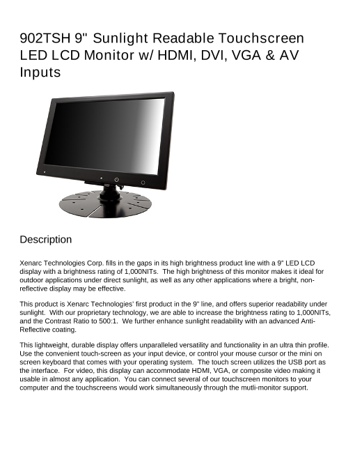 9インチワイドタッチパネル液晶モニター(16:9) 入力(HDMI、DVI、VGA、ビデオx2)、太陽光の下でも見える高輝度タイプ (902TSH 9" Sunlight Readable Touchscreen LED LCD Monitor w/ ...