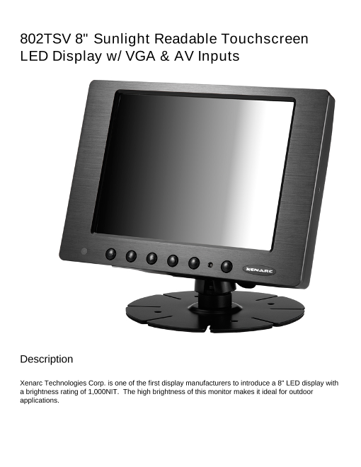 8インチタッチパネル液晶モニター(4:3) VGA入力、ビデオ入力 x 2、太陽光の下でも見える高輝度タイプ (802TSV 8" Sunlight Readable Touchscreen LED Display w/ VGA & AV Inputs...