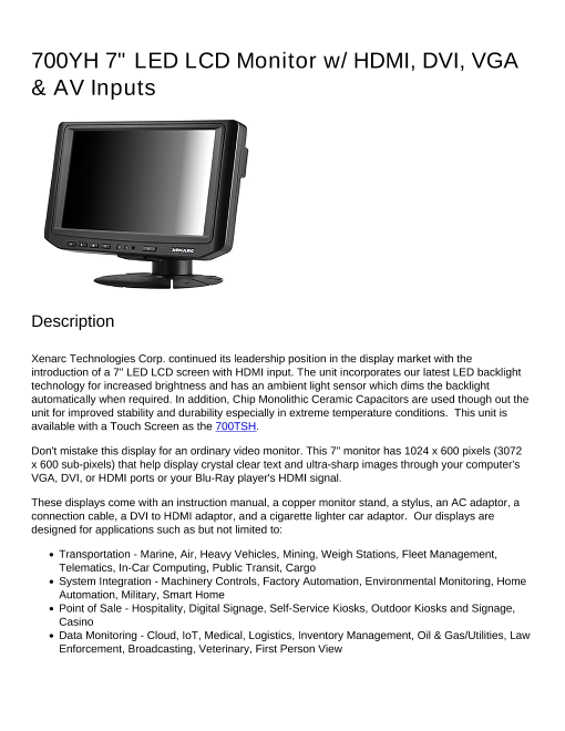 7インチワイド液晶モニター(16:9) HDMI入力、DVI入力、VGA入力、ビデオ入力 x 2 (700YH 7" LED LCD Monitor w/ HDMI, DVI, VGA & AV Inputs)