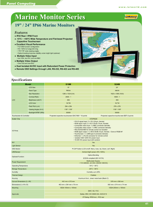 S19M 特長 ■19"高輝度TFT LCD, フラットベゼル, ファンレス ■マルチ入力 (DVIx2, VGAx2, AV) / マルチ出力 (VGA, AV) ■投影静電式マルチタッチパネル ■優れた映像性能 (Full OSD, 0~1...