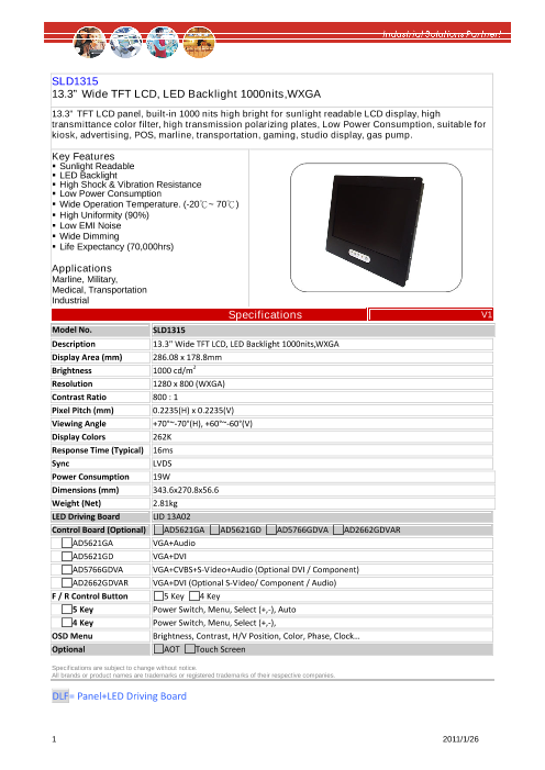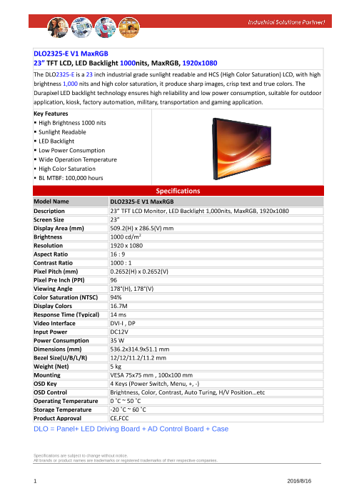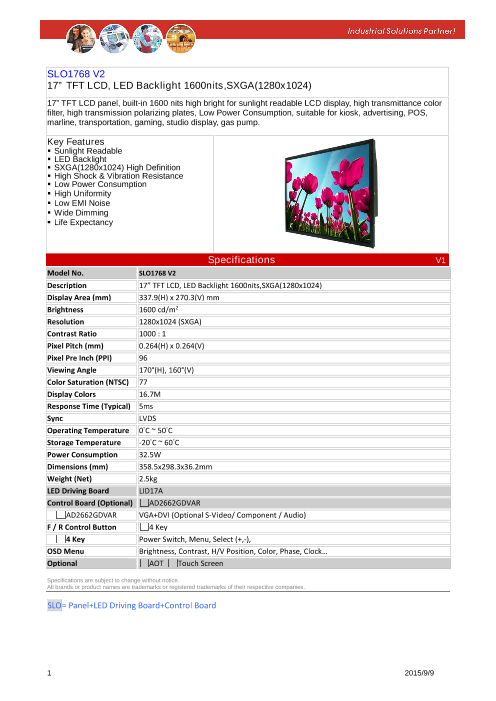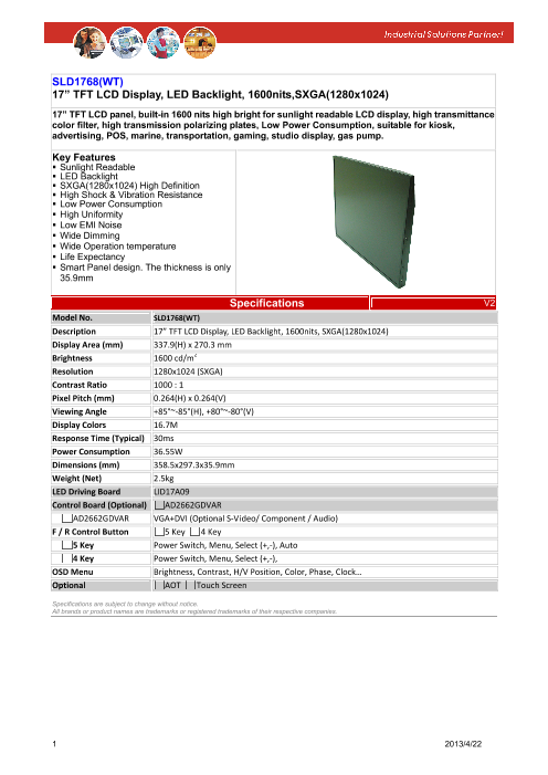 ■17" SXGA TFT LCD ■太陽光の下でも見える超高輝度(1600NIT)液晶パネル採用 ■超寿命LEDバックライト採用 ■高均一性 ■低消費電力(35W) ■耐衝撃、耐振動 ■ワイド動作温度(-20~60℃) ■低EMIノイズ...