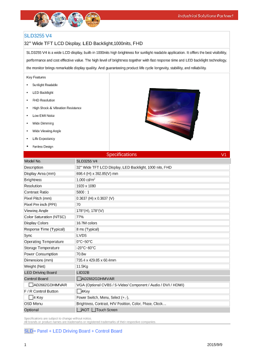 ■32" FHD TFT LCD ■太陽光の下でも見える高輝度(1000NIT)液晶パネル採用 ■超寿命LEDバックライト採用(MTBF:70,000時間) ■低消費電力 71W ■VESA400x100取付対応 ■ワイド動作温度 0~50℃ ...