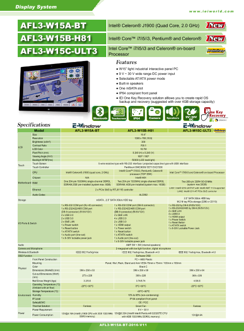 AFL3-W15A-BT 特長 ■15.6" TFT LCD ■ファンレス冷却システム ■低消費電力CPU Celeron J1900 2GHz ■メモリ DDR3L 最大 8GB ■mSATA SSDサポート ■スピーカ内蔵(AMP 3W...