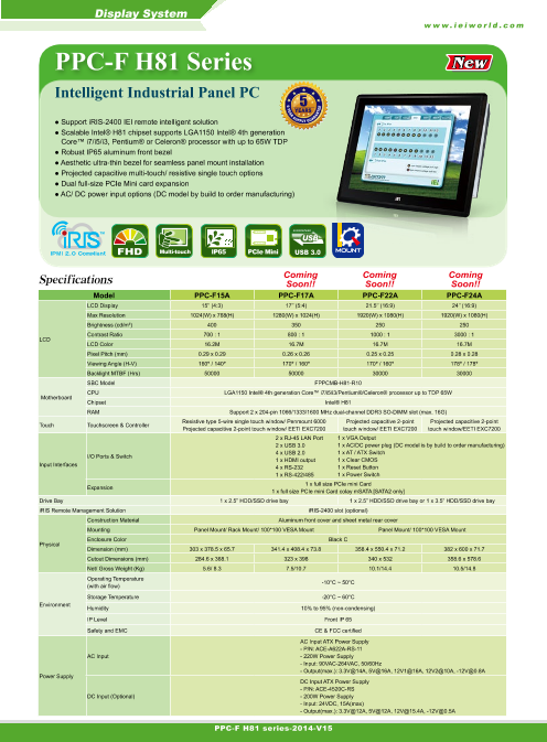 ■15"/17"/22"24" 高輝度 TFT LCD ■エッジの無いフラットベゼル搭載 ■第4世代 Core i7/i5/i3/Pentium CPU ■メモリ 2GB DDR3 x2搭載(最大16GB) PPC-F15A ■投影静電式...