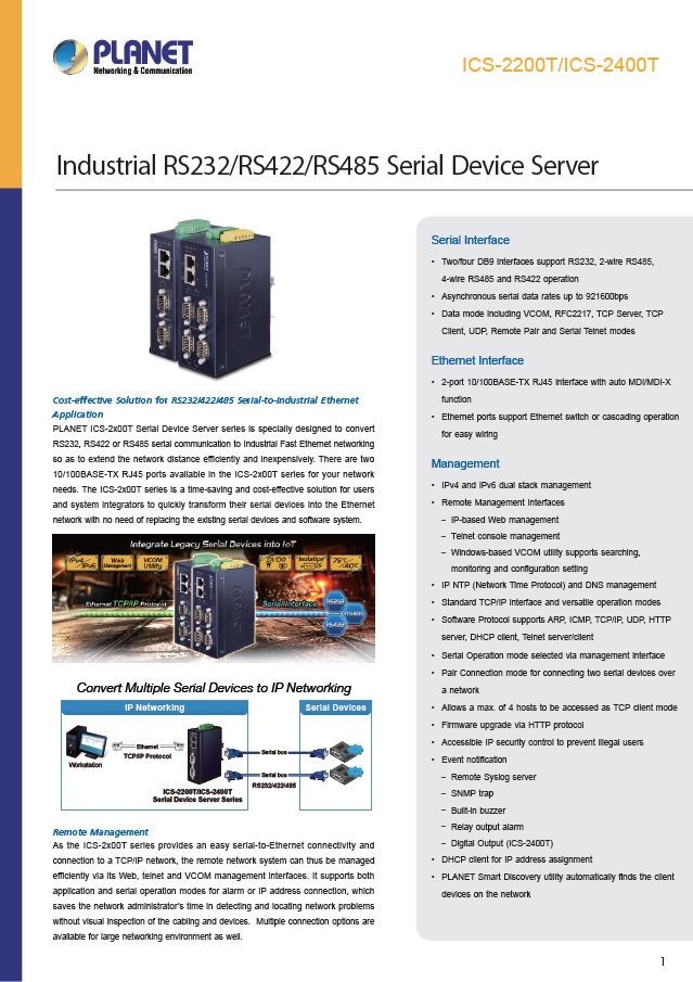 特長 ■IEEE 802.3u 100Base-TX 準拠 ■RS-232/422/485 to 100Base-TX ■転送速度 100Mbps(Cat 5 LANケーブル使用時, 最大100M) ■IP30 メタルケース ■省エネ稼働 ...