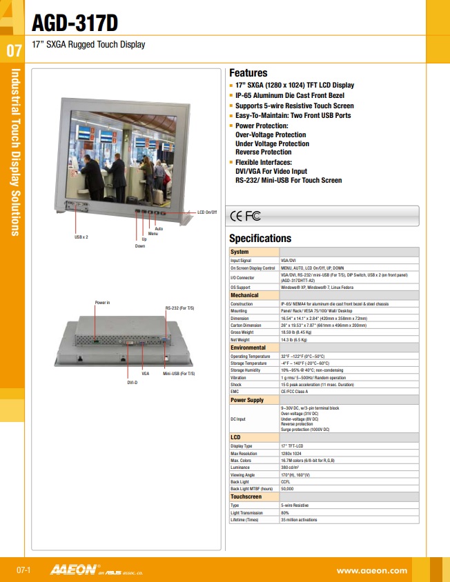 特徴 ■17インチ高輝度TFT液晶 ■ビデオ入力 VGA x 1, DVI-D x 1 ■タッチパネル USB / RS-232C ■フロントパネル防水防塵 IP65 ■アルミダイキャストフロントベゼル 仕様 ■画面サイズ 17インチ ...