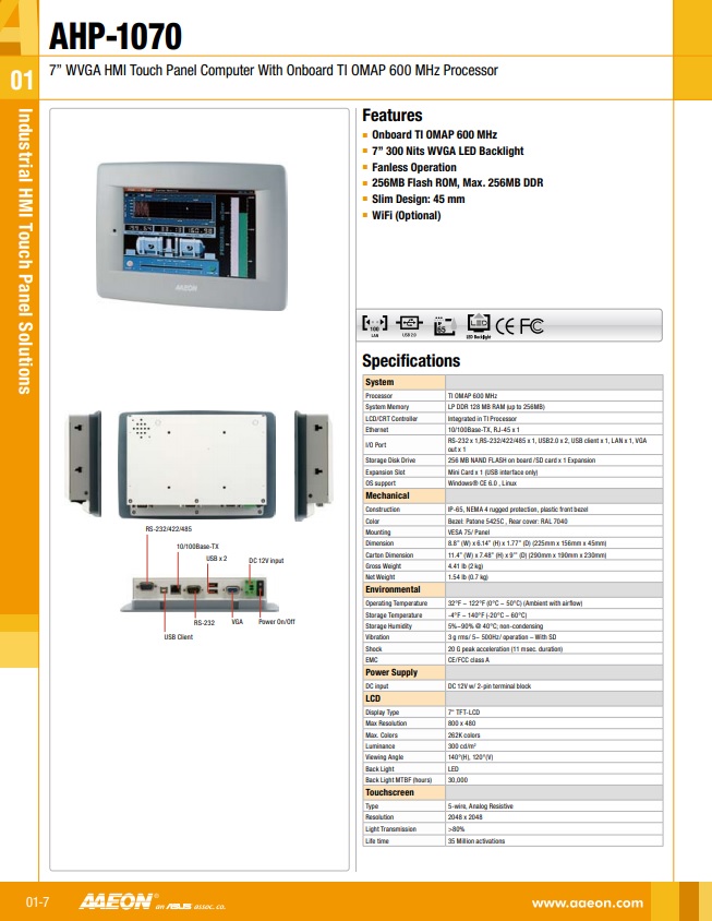 特長 ■7"WVGA 高輝度 TFT LCD ■ファンレス冷却システム ■CPU TI OMAP 600MHz ■NEMA4/IP65 フロントパネル防水/防塵 仕様 ■表示サイズ:7"ワイドTFT LCD ■表示解像度:WVGA(80...