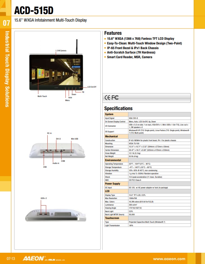 特長 ■15.6インチ WXGA ■入力信号 VGA / DVI ■タッチパネル USB ■2W x 2 スピーカ搭載 ■IP65 フロントパネル防水/防塵 ■強化ガラス表面:硬度7H ■スマートカードリーダー、MSR、カメラ ■マルチユ...