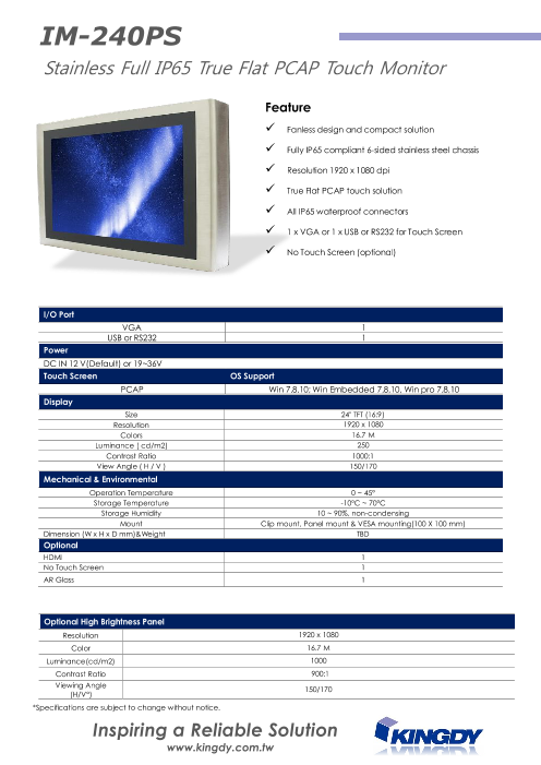 <特長> ・24インチワイド TFT (16:9) ・全面防塵防水 IP65 ・筐体:ステンレス(SUS304)シャーシ ・解像度:1920 x 1080 ・輝度:250cd/m2 ・視野角170°(H)、170°(V) ・タッチパネル 5...