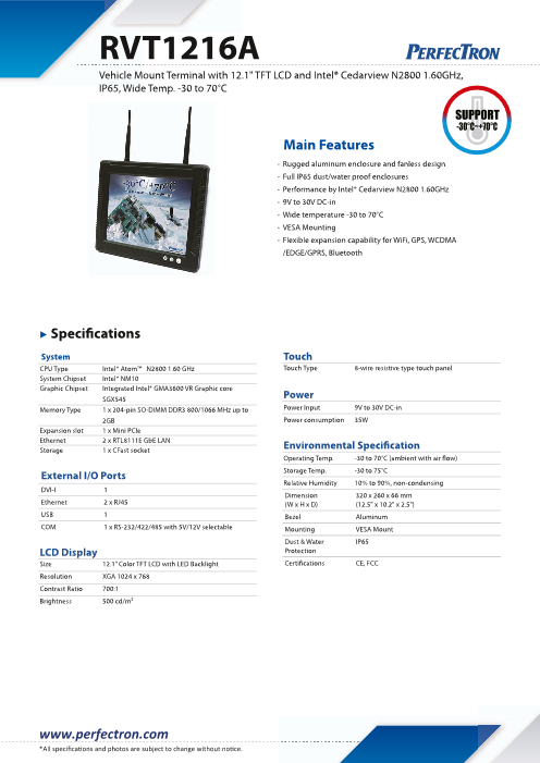 特長 ■12.1" TFT LCD ■低消費電力CPU Atom N2800 1.86GHz ■IP65 全面防水/防塵 ■拡張動作温度 -30~70℃(気流有) 仕様 ■CPU Atom N2800 1.86GHz ■チップセット NM1...