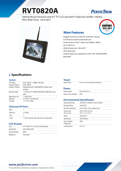 特長 ■8.4" TFT LCD ■低消費電力CPU Atom N2600 1.6GHz ■IP65 全面防水/防塵 ■拡張動作温度 -30~60℃(気流有) 仕様 ■CPU Atom N2600 1.6GHz ■チップセット NM10 ...