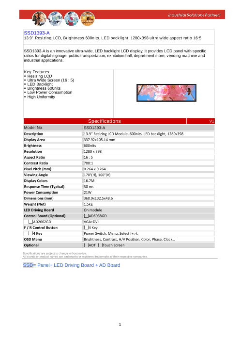 ■13.9" Resizing LCD ■600NIT液晶パネル採用 ■超寿命LEDバックライト採用(MTBF:70,000時間) ■低消費電力 21W ■VESA100取付対応 ■ワイド動作温度 -30~85℃ 仕様 ・画面サイズ 13....