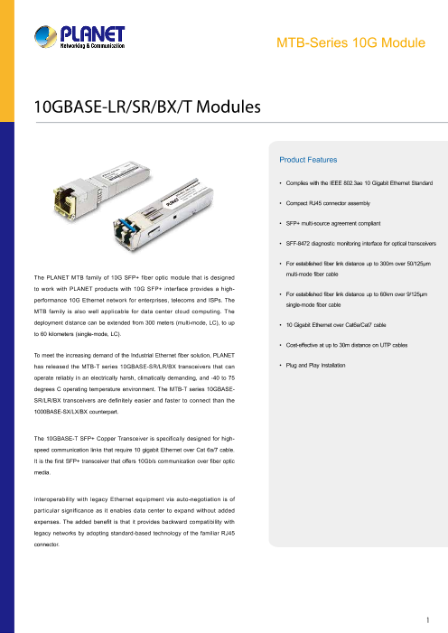 特長 ■IEEE 802.3ae 10 Gb イーサネット対応 ■コンパクトRJ45コネクター ■SFP+ MSA準拠 ■SFF-8472 光トランシーバー診断モニタリング・インターフェース ■50/125μm マルチモード光ファイバーケーブル...