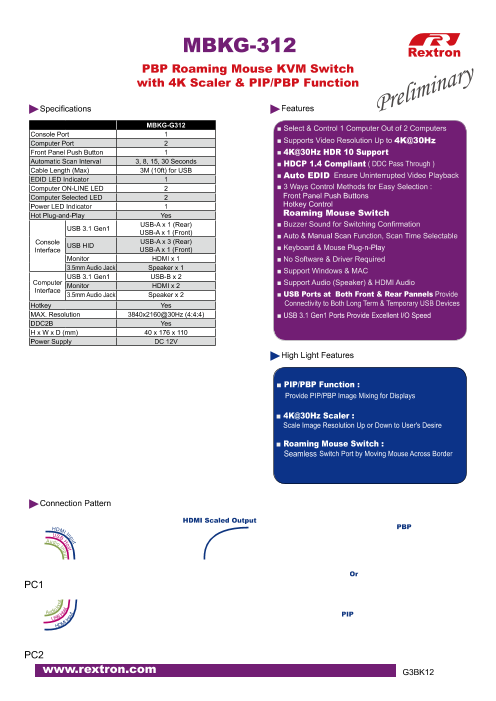 特長 ■ PIP/PBP機能で、画面上に画像を同時表示 ■ 4K@30Hz スケーラーで、画像解像度を変更可能 ■ ローミングマウス機能によるシームレスな切替操作 ■ 2台のコンピューターのうち1台を選択、操作可能 ■ 4K@30Hzまでのビデ...