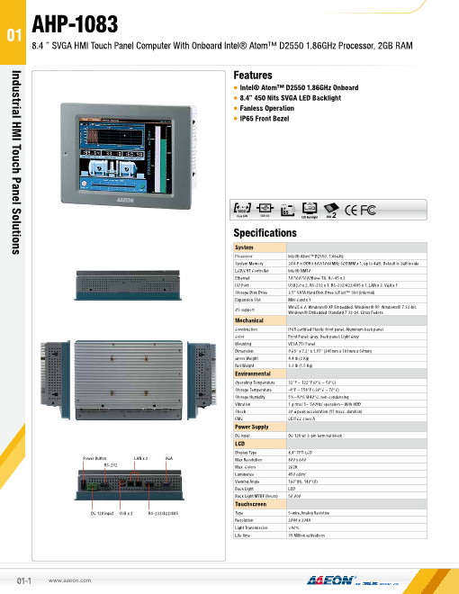 特長 ■8.4"SVGA TFT LCD ■ファンレス冷却システム ■Atom D2550 1.86GHz ■高輝度 450Nits LEDバックライト ■IP65 フロント防水/防塵ベゼル ■2 x GbE 仕様 ■表示サイズ 8.4"...