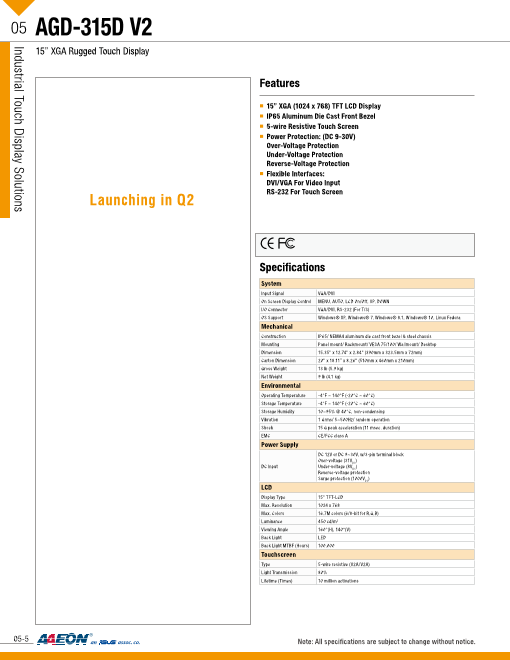 AGD V2シリーズ 15インチ 堅牢タッチパネルモニター