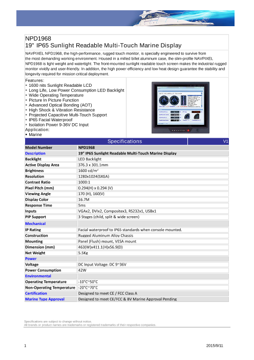 ■19インチカラー TFT LCD ■太陽光の下でも見える超高輝度(1600NIT)液晶パネル採用 ■超寿命LEDバックライト採用 ■反射面減少Advanced Optical Bonding(AOT)採用 ■ワイド動作温度(-10~50℃) ...