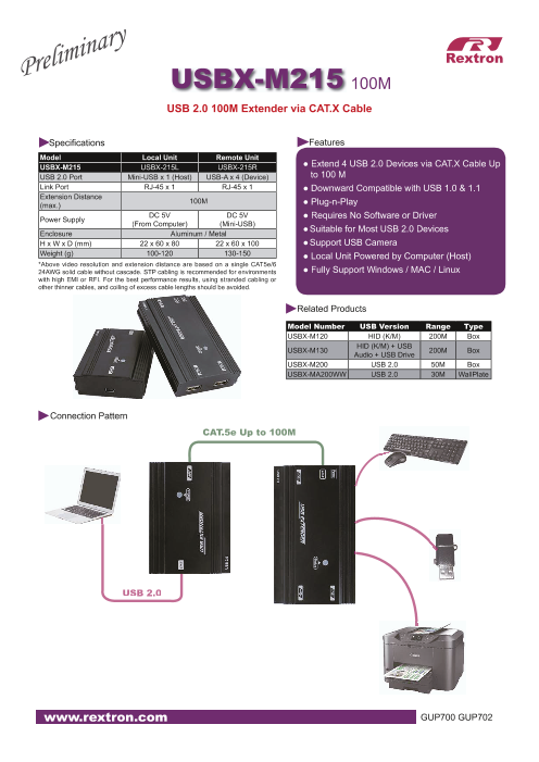 CAT.X ケーブル経由、USB 2.0 100M延長器