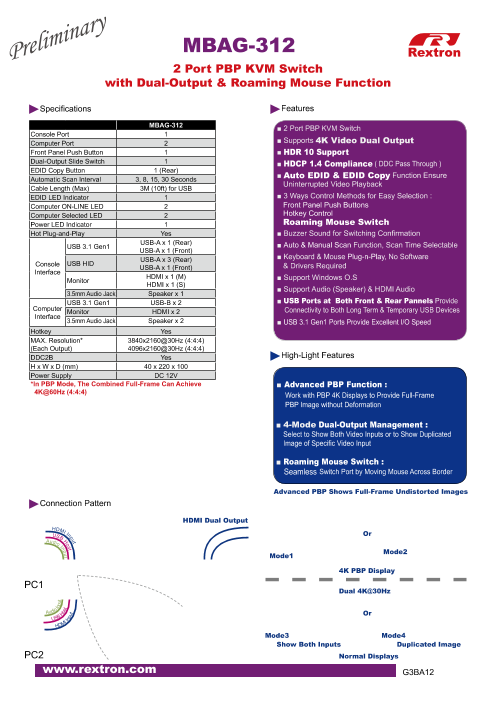 デュアル出力とローミングマウス機能付き双方向2 ポートPBP KVM スイッチ