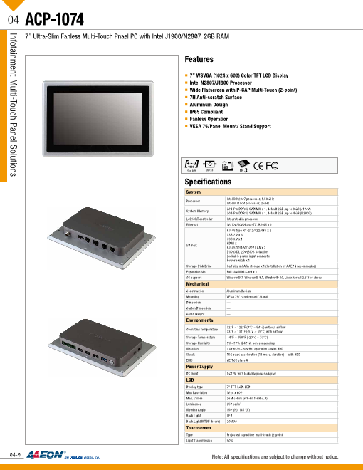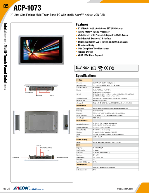 特長 ■7"ワイド WSVGA ■ファンレス冷却システム ■エッジの無いフラットベゼル搭載 ■Atom N2600 1.6GHz ■投影静電式タッチパネル対応 ■強化ガラス表面:硬度7H ■厚さ 13mmLCD + タッチパネル + 20m...