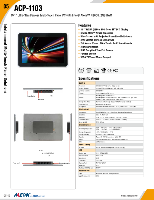 特長 ■18.5インチワイド(16:9) TFT LCD (LEDバックライト) ■True Flatデザイン、ファンレス冷却システム ■低消費電力CPU Celeron J1900 2GHz ■メモリ DDR3L-1333 最大8GB ■Tr...