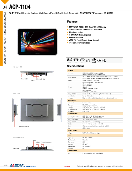 特長 ■10.1"ワイド WSVGA ■ファンレス冷却システム ■エッジの無いフラットベゼル搭載 ■Celeron J1900 2GHz /N2807 1.58GHz ■投影静電式タッチパネル対応 ■強化ガラス表面:硬度7H ■厚さ 13m...