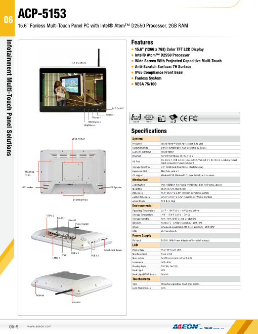 特長 ■15.6"WXGA TFT LCD ■ファンレス冷却システム ■エッジの無いフラットベゼル搭載 ■Atom D2550 1.86GHz ■投影静電式タッチパネル対応 ■強化ガラス表面:硬度7H ■IP65 フロント防水/防塵ベゼル...