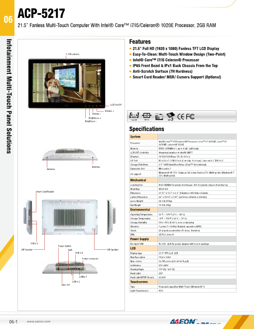 特長 ■21.5" フルHD TFT LCD ■ファンレス冷却システム ■エッジの無いフラットベゼル搭載 ■Core i7/i5/Celeron ■IP65 フロント防水/防塵ベゼル ■投影静電式タッチパネル対応 ■強化ガラス表面:硬度7...