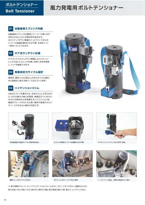風力発電用 多段式ボルトテンショナーは2段式ピストン内蔵のため、本体がスリムでありながら、大きな締付け軸力を発揮するハイテンション型ボルトテンショナー。 ■ 多段式ボルトテンショナーはボルトサイズ:M24~M160まで製造可能。インチサイズや特注仕...