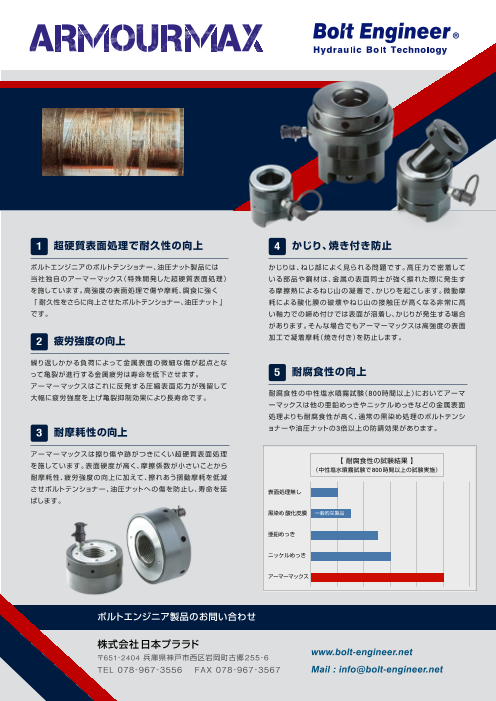■ アーマーマックス 超硬質表面加工で耐久性をさらに向上させたボルトテンショナー ボルトエンジニアのボルトテンショナー、油圧ナットには当社独自のアーマーマックス 特殊開発した超硬質表面加工を施しています。高強度の表面加工で傷や摩耗、腐食に強く「耐久性を...