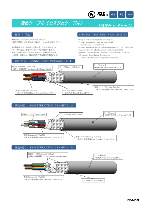 【特徴 ・ 用途】 ・異なる導体サイズ・同軸等の複合ケーブルの作成が可能です。 ・各種絶縁材料での作成も可能です。(PF・ETFEなど) ・シールド(編組・横巻・アルミテープ)の選択可能です。 ・UL(AWM)・NFPA(70・79)、cUL(...