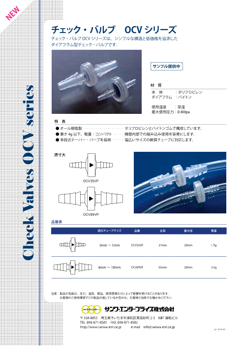 オール・プラスチック製 チェック・バルブOCVシリーズは、シンプルな構造と低価格を追求したダイアフラム型チェック・バルブです ●オール樹脂製 ●重さ4g以下、軽量・コンパクト ●多段式テーパー・バーブを採用