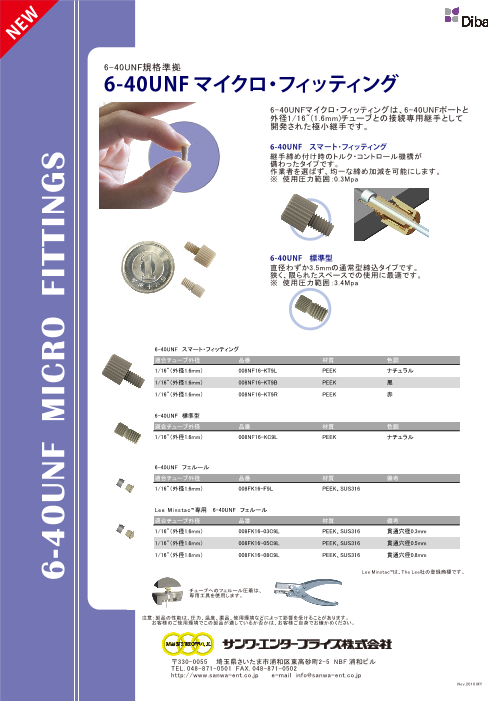 6-40UNFマイクロ・フィッティングは、6-40UNFポートと外径1/16"(1.6mm)チューブとの接続専用継手として製作されました。作業者を選ばず均一な締込トルクの管理が可能なスマート・フィッティング最小モデルです。