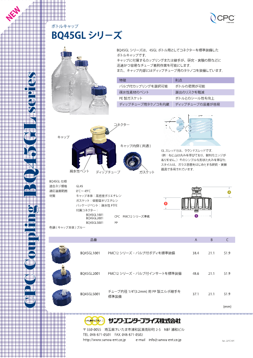 ボトル交換の際、ボトルからキャップを取り外すことなく、カップリングの脱着のみでスピーディーなボトル交換を可能にします。 ●簡単かつ確実に試薬瓶へのライン着脱が可能 ●キャップ内側にディップチューブ用タケノコを内蔵 ●疎水性素材のベントにより漏出のリ...