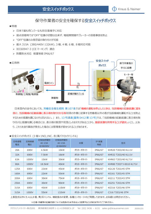■ 特徴 ・クラウスアンドナイマー社製ディスコネクトスイッチ内蔵 ・耐圧防爆構造 Exd II C T6 防塵防水 IP66 ・負荷開閉可能 定格電流 最大55A ・丸型圧着端子対応 端子構造 ・確実な断路保証 ・南京錠取付可能...