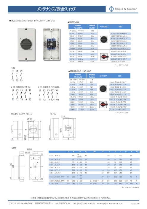 クラウスアンドナイマー社製スイッチの標準接点構成図をご紹介しています。 【掲載内容】 ◆ON-OFFスイッチ ◆双投スイッチ ◆マルチステップスイッチ ◆制御回路用スイッチ ◆モーター用スイッチ ◆モーター制御用スイッチ ◆電圧計用ス...