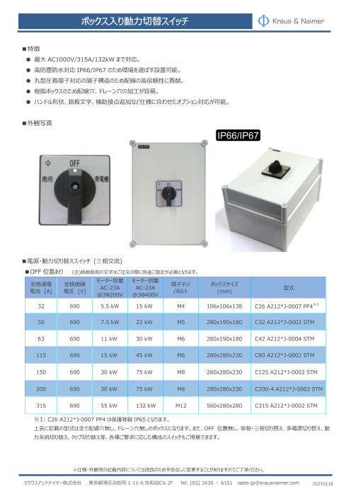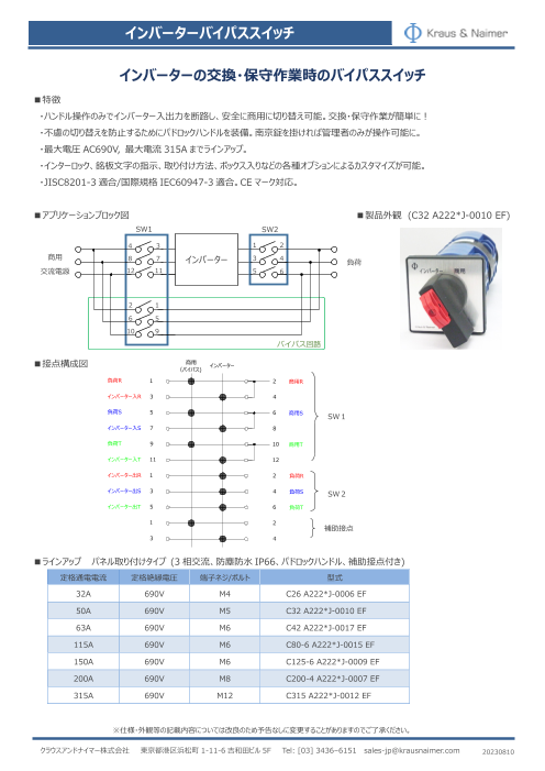 ■特徴 ・ハンドル操作のみでインバーター入出力を断路し、安全に商用に切り替え可能。交換・保守作業が簡単に! ・不慮の切り替えを防止するためにパドロックハンドルを装備。南京錠を掛ければ管理者のみが操作可能に。 ・最大電圧AC690V, 最大電流315...