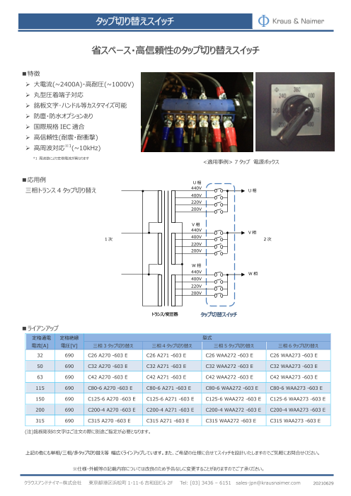 ◆⼤電流(~2400A)・高耐圧(~1000V) ◆丸型圧着端子対応 ◆銘板文字・ハンドル等カスタマイズ可能 ◆防塵・防水オプションあり ◆国際規格IEC適合 ◆高信頼性(耐震・耐衝撃) ◆高周波対応 ~10kHz (周波数により定格電流が異...