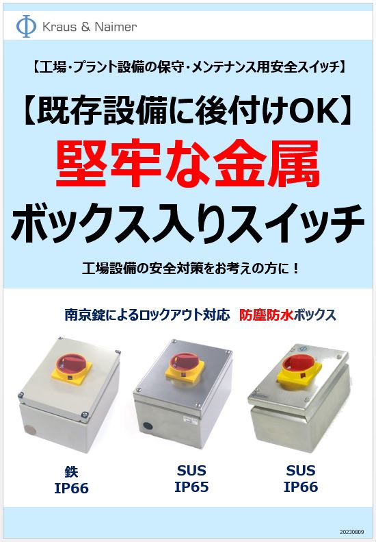 ●装置の手元に設置 工場やプラントで使用されるモーター機器などの手元に設置し、機器への電源ラインを直接ON/OFFさせることができるボックス入りスイッチです。 仮に保守・メンテナンスの際に他の作業者が誤って離れた場所にある配電盤の電源を入れたとしても...