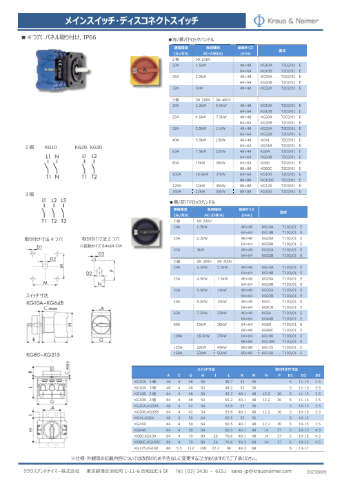 【ラインナップ】 ◆4つ穴 パネル取り付け, IP66 ◆単穴 パネル取り付け, IP66 ◆底面取り付け ドアクラッチ付きスイッチ , IP66/67 ※仕様・外観等の記載内容については改良のため予告なしに変更することがありますのでご了...