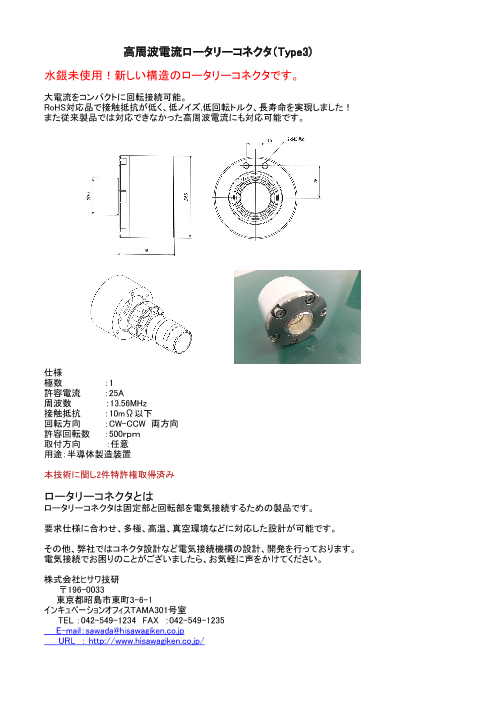 ■特徴 ・水銀未使用。 ・大電流をコンパクトに回転接続可能。 ・RoHS対応品で接触抵抗が低く、低ノイズ、低回転トルク、長寿命を実現しました! ・従来製品では対応できなかった高周波電流にも対応可能です。 ・標準品ランナップは10A,50Aの2種...