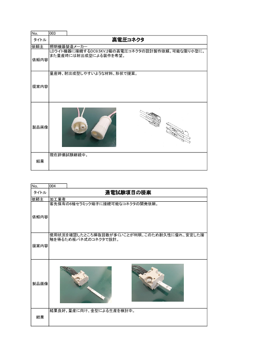 高電圧コネクタ ・可能な限り小型に。 ・量産時には射出成型による製作を希望。 ・量産時、射出成型しやすいような材料、形状で提案。 通電試験項目の提案 ・使用状況を確認したところ挿抜回数が多くいことが判明。 ・耐久性に優れ、安定した接触を得るた...