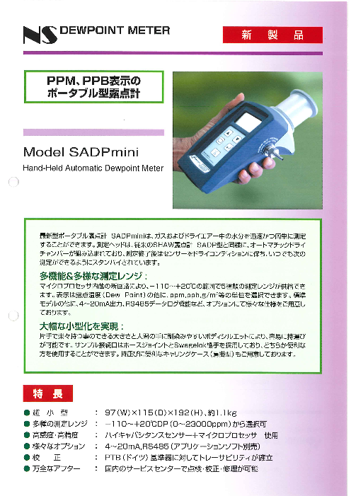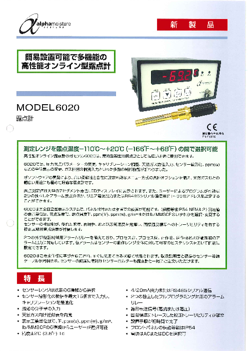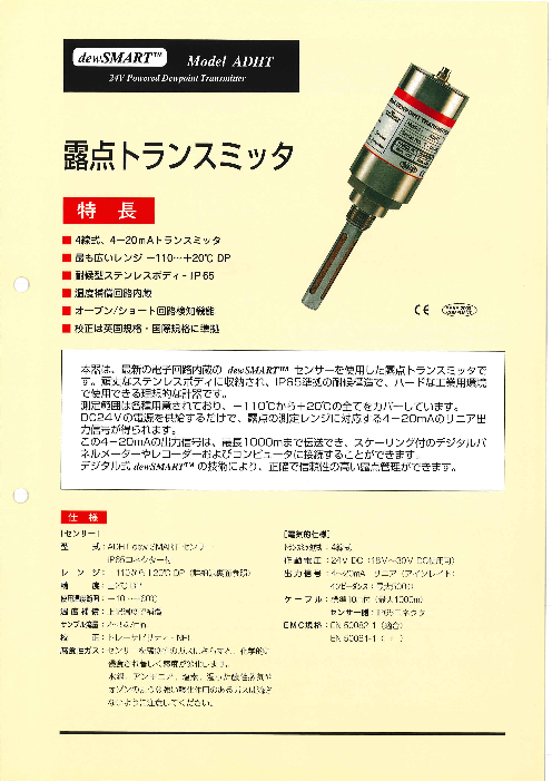 ・超小型:97(W)Xl15(D)X192(H)、約1.1kg ・多種の測定レンジ:-110~+20℃DP (0~23000ppm)から選択可 ・高感度・高精度:ハイキャパシタンスセンサー+マイクロプロセッサ使用 ・様々なオプション:4~20mA,...