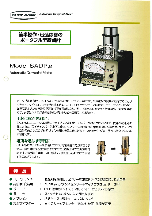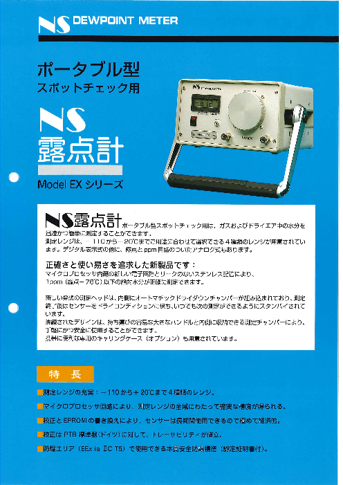 ◆ドライチャンバー:乾燥剤を使用し、センサーを常にドライな状態に保って即応答 ◆高感度・高精度:ハイキャパシタンスセンサー+マイクロプロセッサ使用 ◆校正:PTB標準器(ドイツ)に対してトレーサビリティが確立 ◆操作:スイッチ1つの操作のみで露点を...