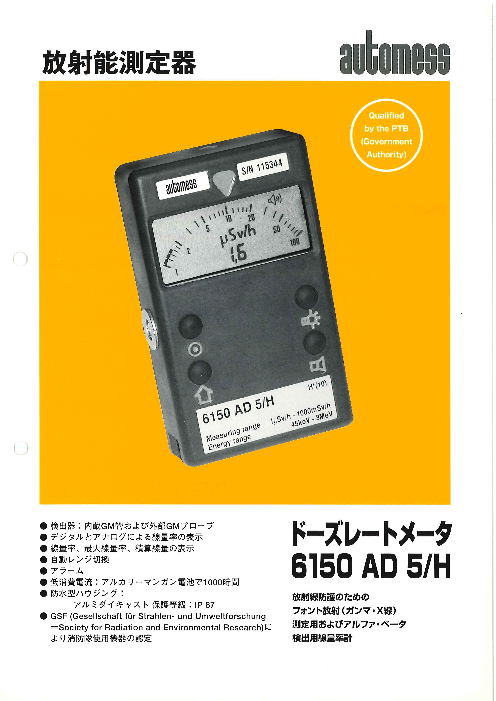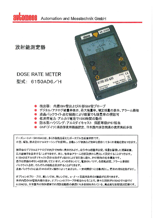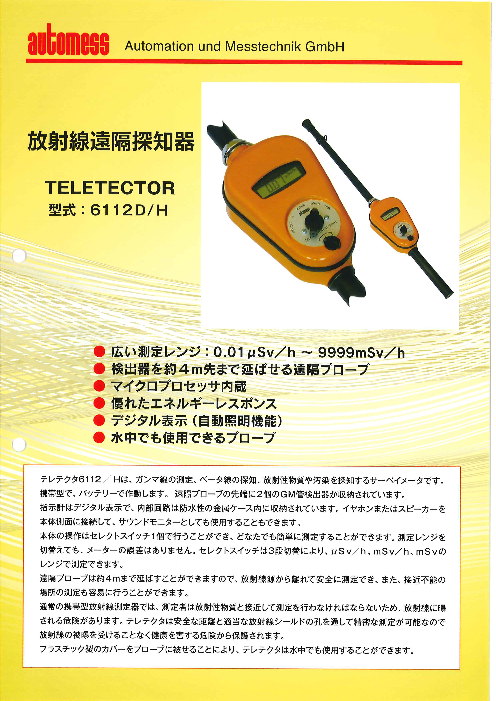 ◆広い測定レンジ:0.01μSv/h~9999mSv/h ◆検出器を約4m先まで延ばせる遠隔プローブ ◆マイクロプロセッサ内蔵 ◆優れたエネルギーレスポンス ◆デジタル表示(自動照明機能) ◆水中でも使用できるプローブ ◆詳細はカタログを...